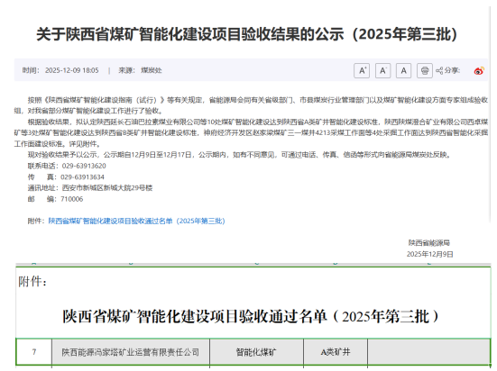 近日,陕西省能源局公布了关于陕西省煤矿智能化建设项目验收结果的公示(2025年第三批),皇冠足彩网官网首页冯家塔矿业运营有限责任公司位列其中。