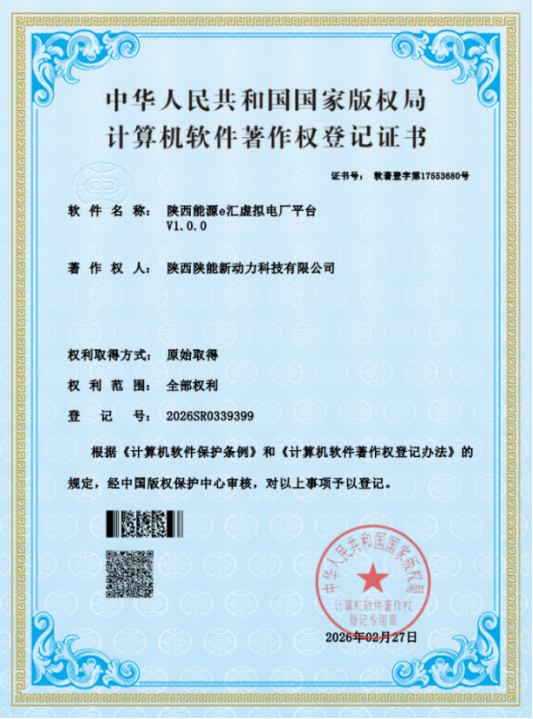 近日,能动科技成功获得“皇冠足彩网官网首页e汇虚拟电厂平台V1.0.0”计算机软件著作权登记证书。这是继“陕投集团充换电智慧运营管理平台V1.0.5”“智慧充换电服务小程序V1.0.0”等软件著作权之后,能动科技在新能源数智化领域取得的第六项软件核心成果。